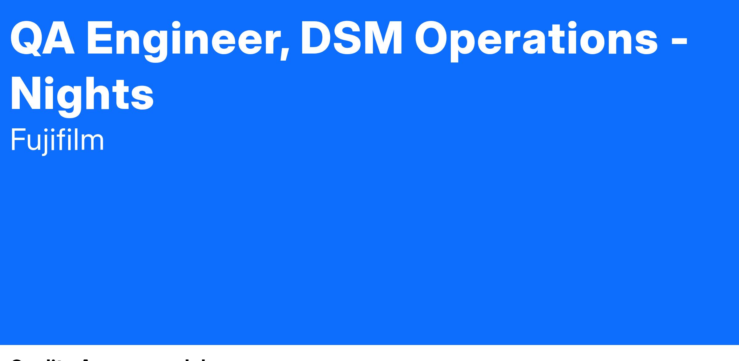 The QA Engineer, DSM Operations (Night) is responsible to help drive the Quality oversight for the direction of all Drug Substance Manufacturing processes during the night shift. This role collaborates within the DSM Quality team as well as with other cross-functional teams. Ensures that all DSM systems and processes are operated/maintained as intended, with a focus on consistent policy administration, QA oversight of activities occurring during your shift and resolution or mitigation of issues occurring during operation.